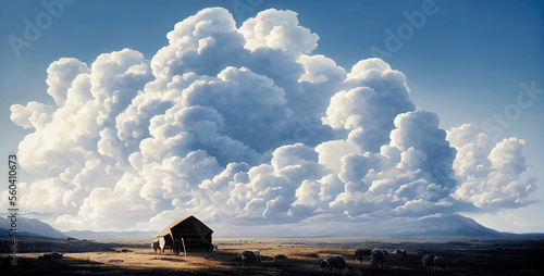 Rural landscape with big white clouds in blue sky over field, hut and sheep (Generative AI)