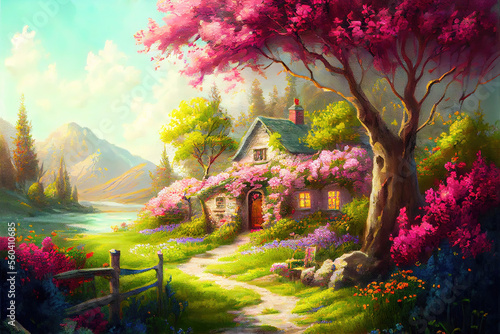 Romantic house in spring landscape with colorful flowers and tree (Generative AI)