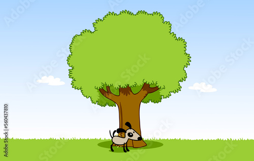 Small cartoon dog peeing urine on tree in garden