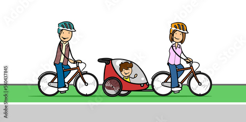 Familie beim Fahrrad fahren mit Kind im Fahrradanhänger