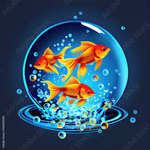Three goldfish swimming in water bubble as abstract illustration (Generative AI)
