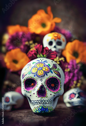 Sugar skull decoration with flowers as day of the dead concept (Generative AI)