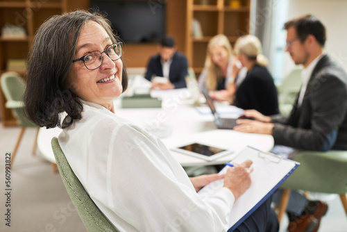 Glückliche Geschäftsfrau mit Klemmbrett im Meeting