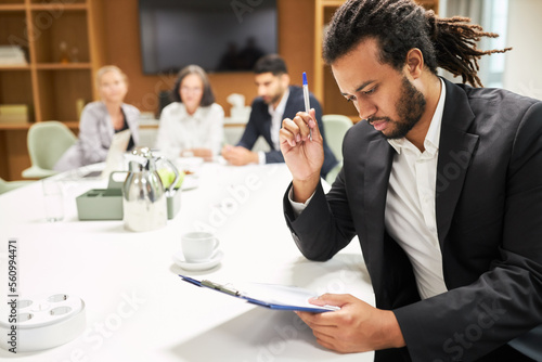 Afrikanischer Geschäftsmann liest skeptisch einen Vertrag