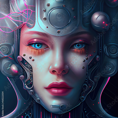 Young fictional female cyberpunk cyborg woman with glowing circuit boards (Generative AI)