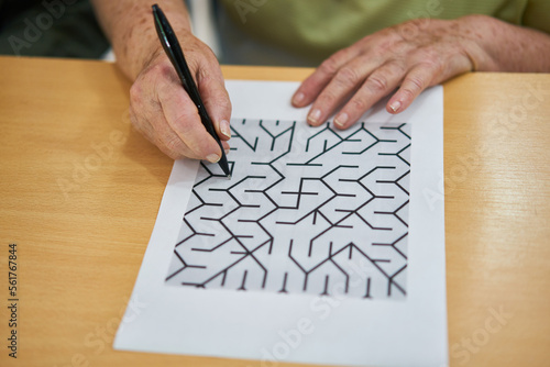 Hand von Seniorin mit Stift beim Labyrinth Rätsel lösen
