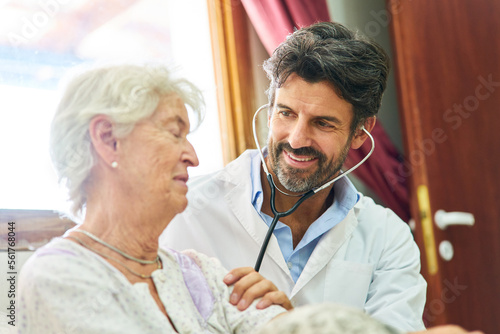 Hausarzt beim Abhorchen einer Seniorin mit Stethoskop