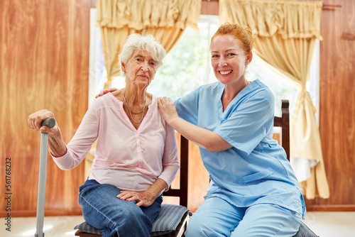 Altenpflegerin kümmert sich um Seniorin mit Krückstock
