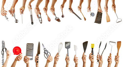 Viele Hände halten verschiedene Küchenwerkzeuge