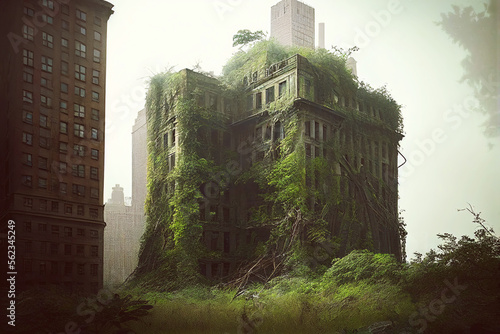 Ivy plants climbing on building in abandoned city (Generative AI)