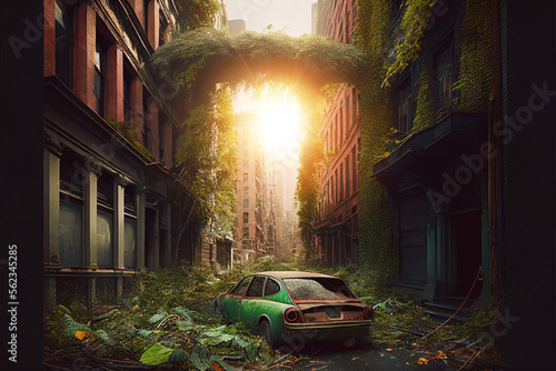 Old car wreck in street of abandoned city with ivy reclaiming the buildings (Generative AI)