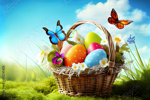 Easter basket with colorful easter eggs, flowers and butterflies as easter background illustration (Generative AI)