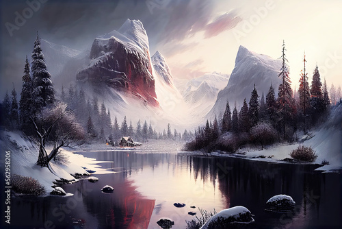 Magical winter mountain landscape with house by the lake (Generative AI)