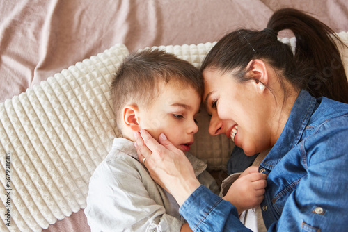 Little boy tenderly cuddles with his mother