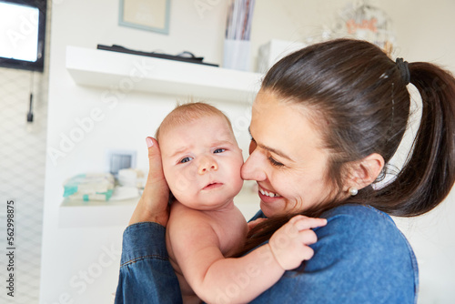 Mother gives baby a tender kiss on the cheek