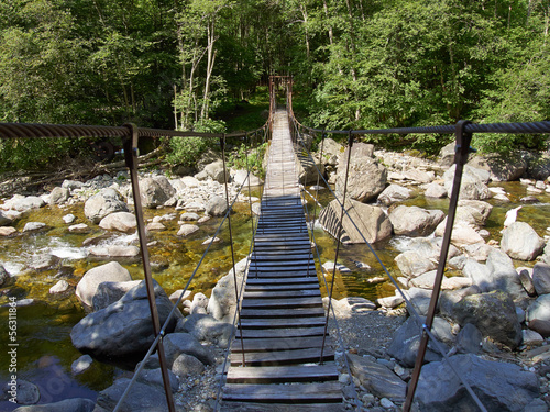 Old long wooden suspension bridge leading to tropical island (Generative AI)