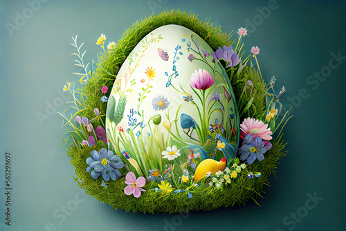 Painting of beautiful easter egg with floral design on grass as easter background illustration (Generative AI)