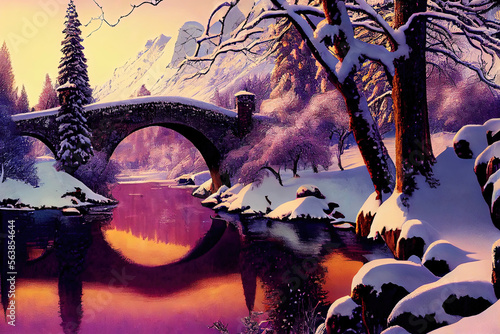 Romantic winter landscape with mountains, forest and bridge over a river in beautiful light (Generative AI)