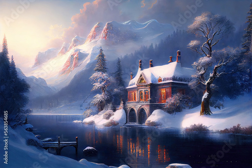 Magical winter mountain landscape with house by the lake (Generative AI)