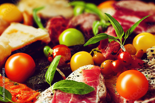Top view of fresh antipasti with cheese ham and tomatoes (Generative AI)