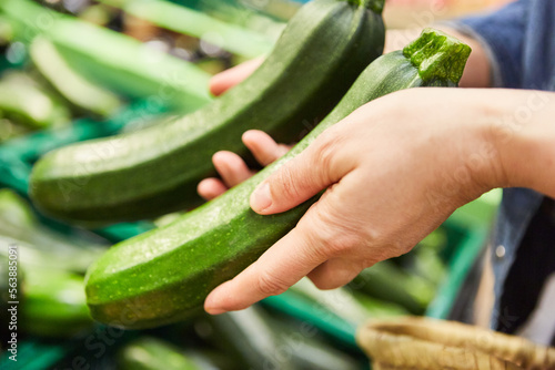 Hände halten Zucchini beim Einkaufen im Supermarkt