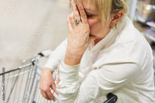 Besorgte Kundin mit Hand an der Stirn beim Einkaufen