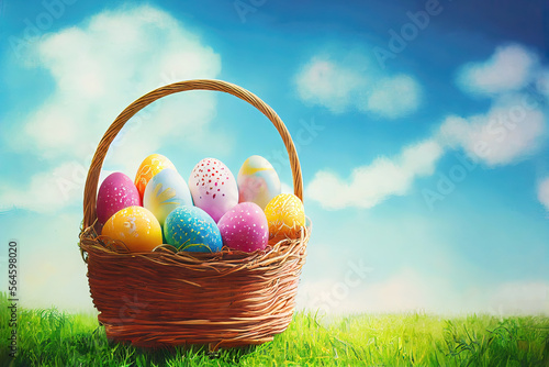 Easter basket with colorful easter eggs as easter background illustration (Generative AI)