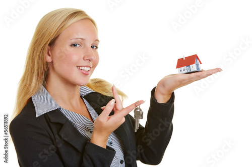 Maklerin hält Haus und Schlüssel