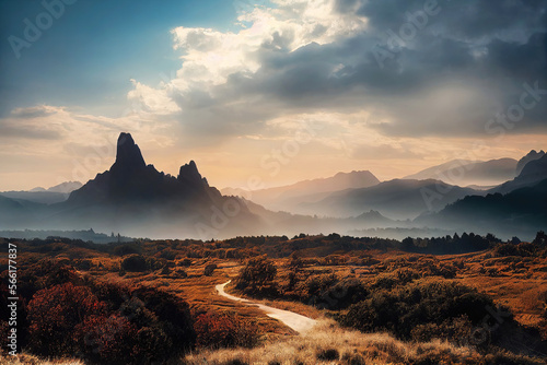 Beautiful mountains and fields at sunset as landscape illustration (Generative AI)