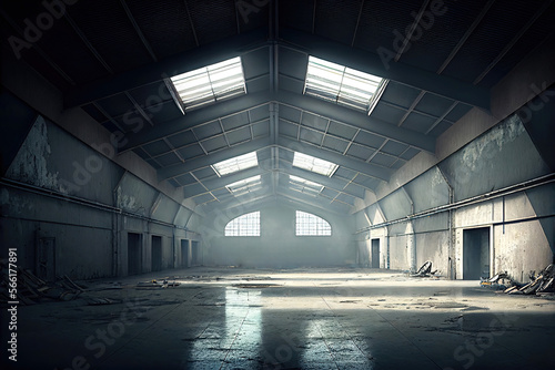 Empty old military hangar or warehouse storage hall (Generative AI)