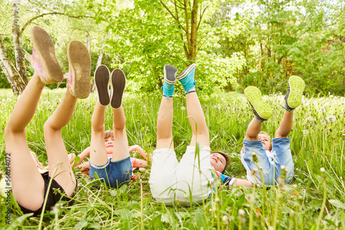 Children having fun lying in meadow at garden