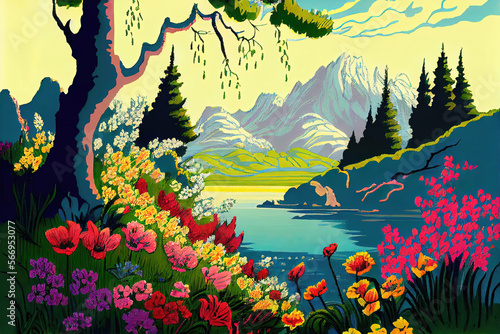 Spring anime landscape with flowers, lake and mountain (Generative AI)