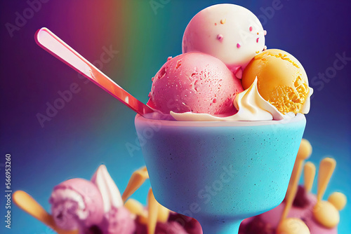 Colorful ice cream sundae with vanilla and strawberry scoops (Generative AI)