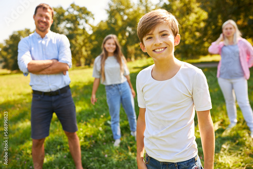 Smiling boy and family on a walk