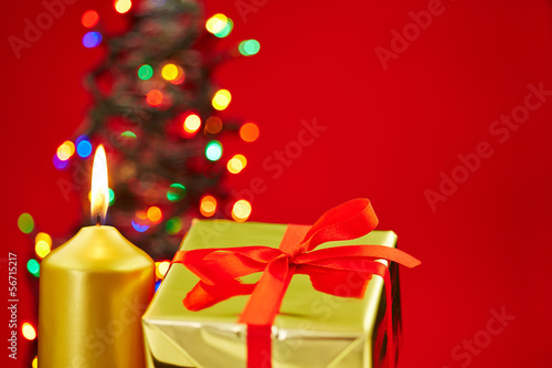 Weihnachten mit Kerze und Geschenk vor rotem Hintergrund