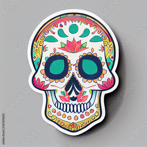 Colorful sugar skull as sticker for day of the dead celebration (Generative AI)