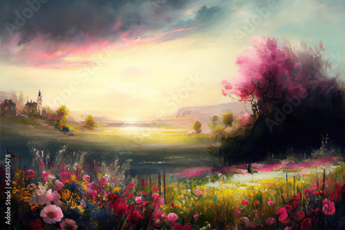 Flowers on meadow in spring nature landscape as vintage painting (Generative AI)