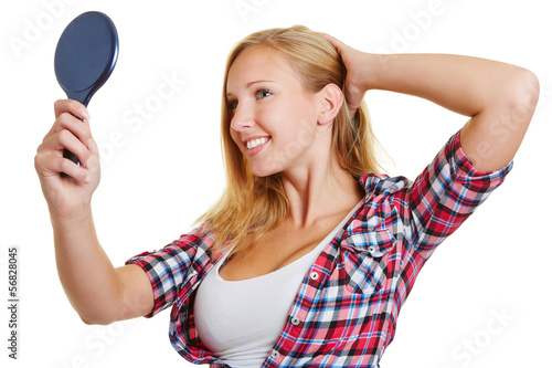Zufriedene Studentin steht vor Tafel mit Muskel Armen als Konzept