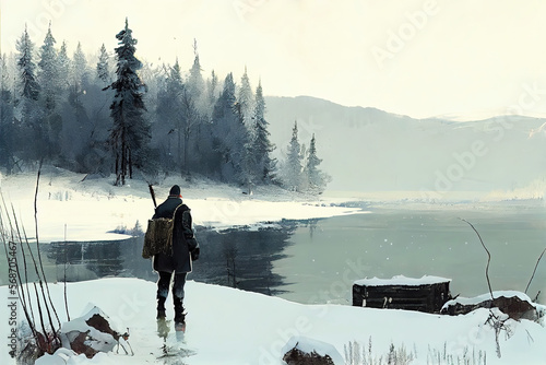 Man at lake in winter ice fishing in snow landscape (Generative AI)
