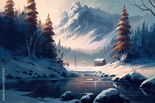 Winter landscape with cabin by a lake in the mountains with snow (Generative AI)