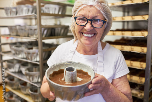 Bäckerin mit Erfahrung zeigt stolz einen Gugelhupf