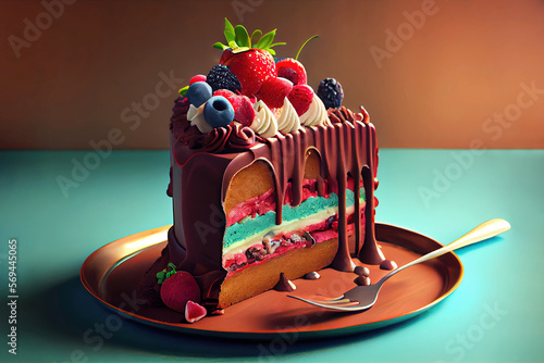 Slice of delicious chocolate cake with many colorful layers and berry topping as dessert illustration (Generative AI)