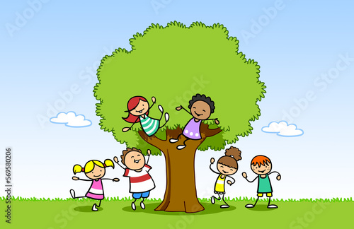 Group of cartoon kids climbs on tree and have fun