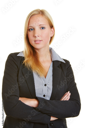 Zufriedene Studentin steht vor Tafel mit Muskel Armen als Konzept