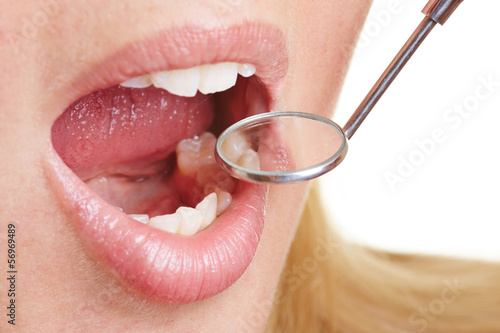 Close-up of a dental examination with mirror and patient's healthy white teeth