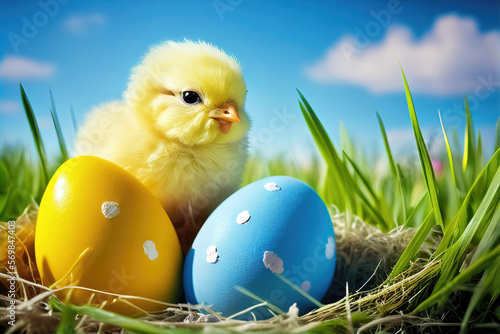 Cute baby chick sitting in nature in nest with easter eggs as illustration (Generative AI)