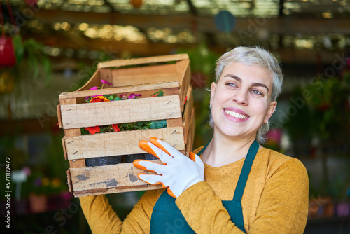 Junge Gärtnerin in der Ausbildung trägt eine Kiste Blumen
