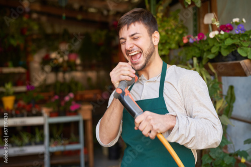 Junger Gärtner hat Spaß beim lauten Karaoke Gesang