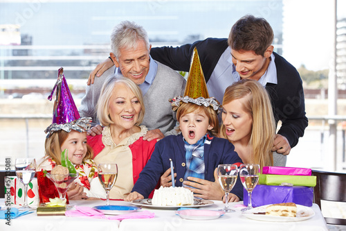 Kind pustet Kerze aus bei Geburtstagsfeier