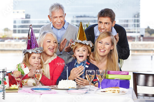 Kind pustet Kerze aus bei Geburtstagsfeier